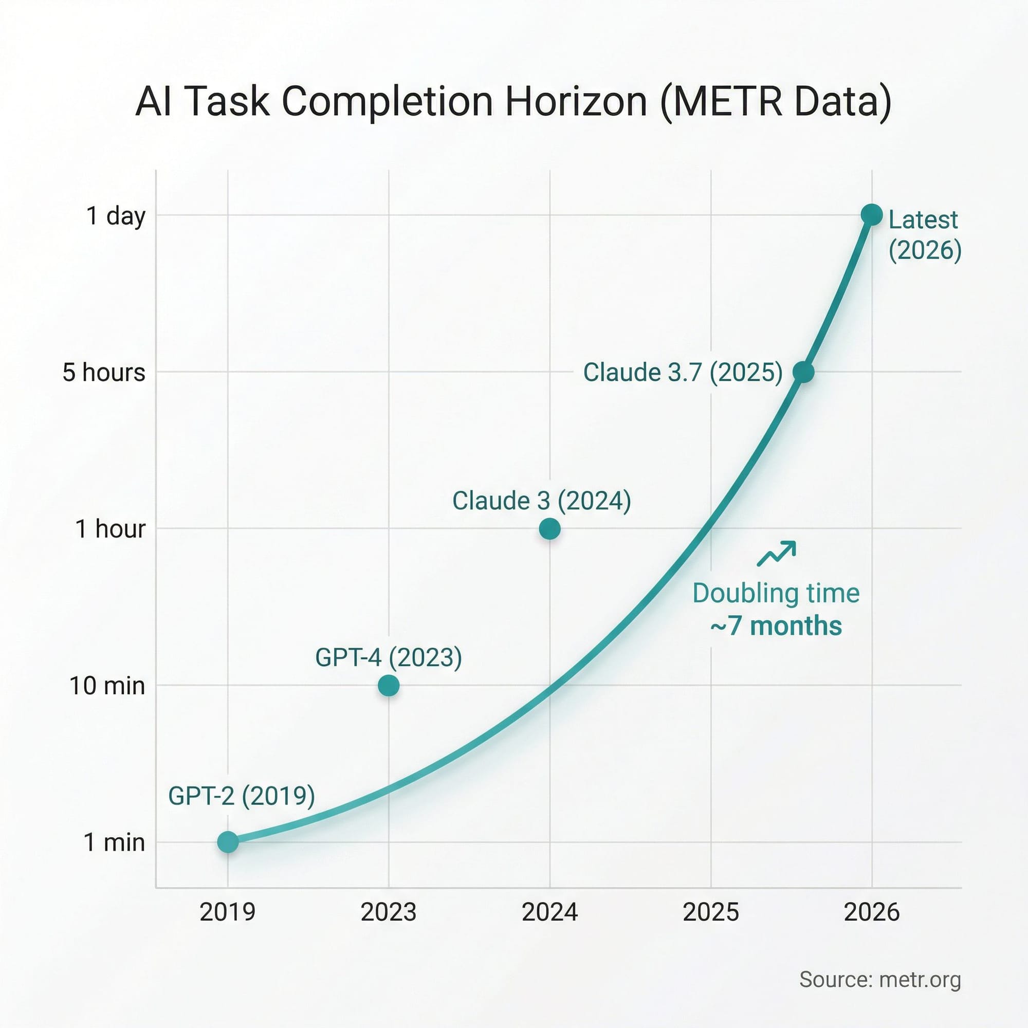 Doubling time: approximately 7 months. If this continues, AI that can work independently for weeks arrives within 2-3 years.