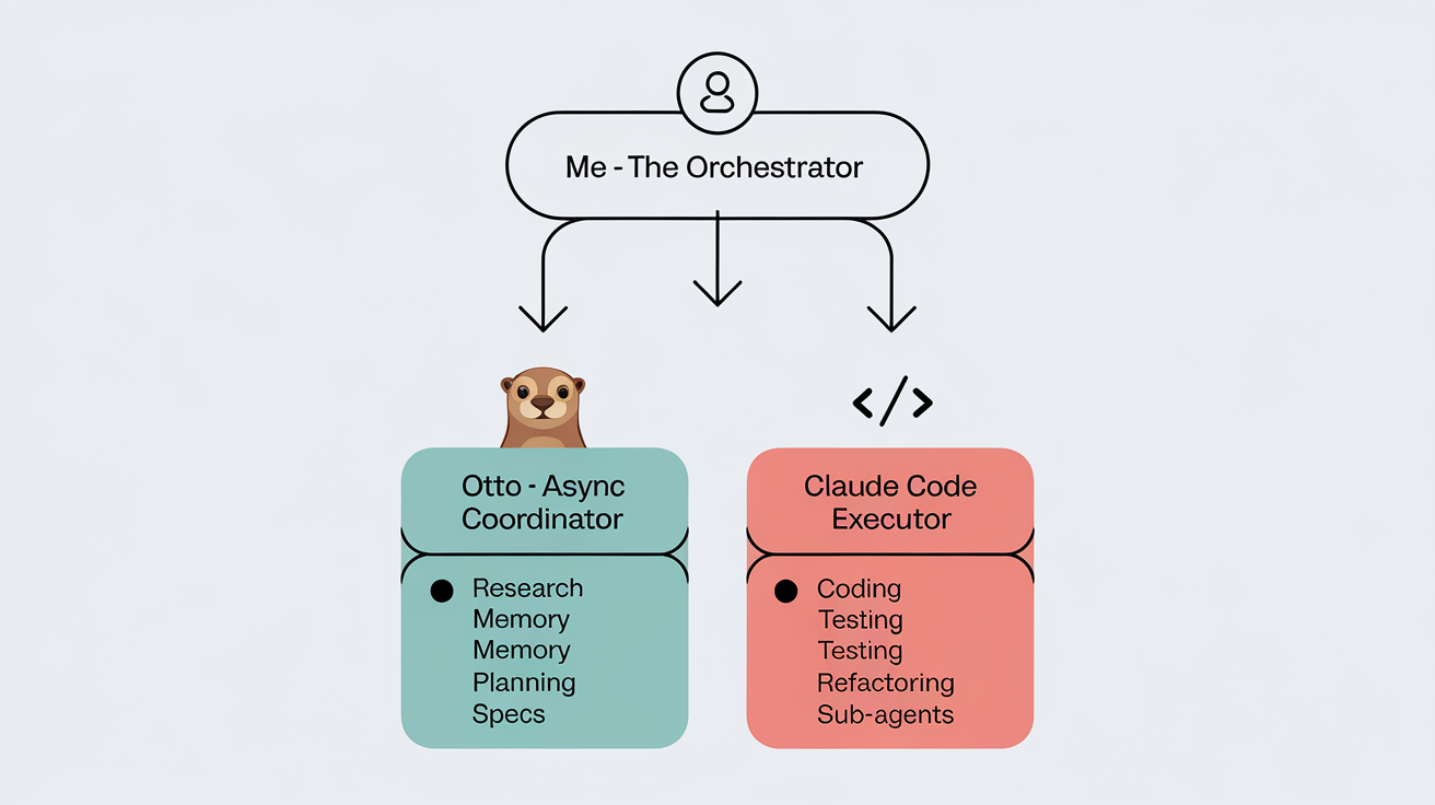 My setup is simple: Otto (my async AI coordinator) handles research, planning, and memory. Claude Code (in my IDE) handles execution. I describe outcomes. They build.